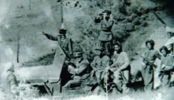 بەرەی شەڕی سەقزە ، ساڵی ١٣٢٥ی هەتاوی . محەمەد حوسێن خان لە پشت فەرمانی جیبەکەیە ، ئەو دوو ئەفسەرە دەبێ خۆشەوی خەلیل و عیزەت عەبدولعەزیز بن