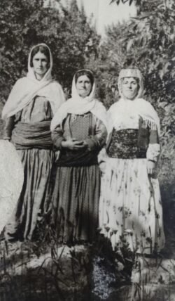 لە راستەوە : حاجی ھاجەر خانم ژنی قازی کەریم، یای مرێم خۆشکی حاجی ھاجەرخانم ، کوبرا خانمی جەوانمەرد قازی کچی عبدالرحیم جەوانمەردی قازی .