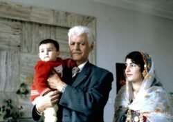 لە راستەوە: سەکینە خانم، بابە میرزا خەلیل فەتاح قازی، لە باوەشی بابەی سامرەند فەتاح قازی.