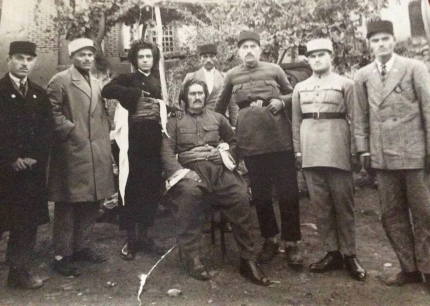 بەرەی شەڕی سەقزە ، ساڵی ١٣٢٥ی هەتاوی . محەمەد حوسێن خان لە پشت فەرمانی جیبەکەیە ، ئەو دوو ئەفسەرە دەبێ خۆشەوی خەلیل و عیزەت عەبدولعەزیز بن