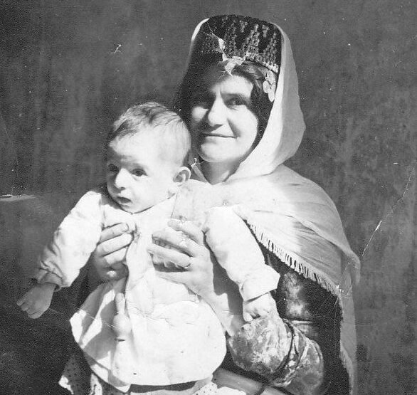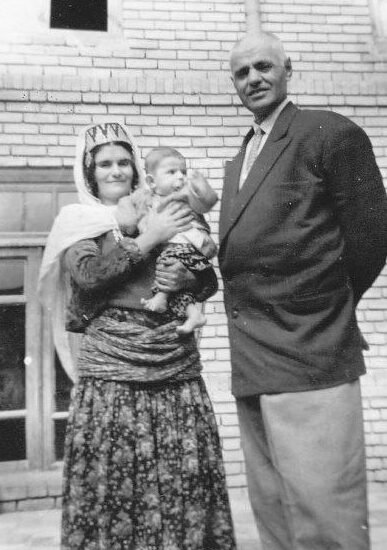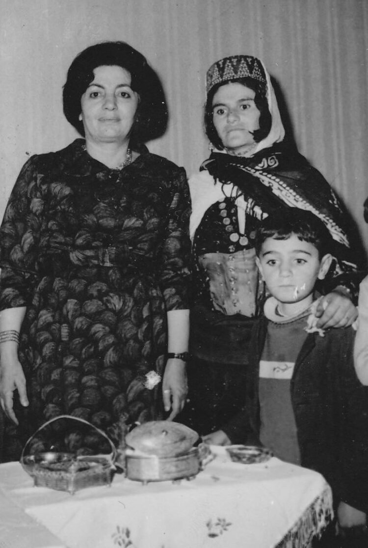 لە راستەوە: سەکینە خانم، بابە میرزا خەلیل فەتاح قازی، لە باوەشی بابەی سامرەند فەتاح قازی.